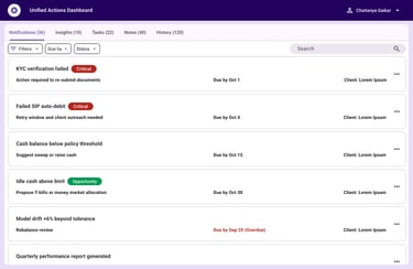 Financial advisors and staff waste valuable time navigating multiple tools to find, prioritize, and complete client action items—leading to missed opportunities and errors.